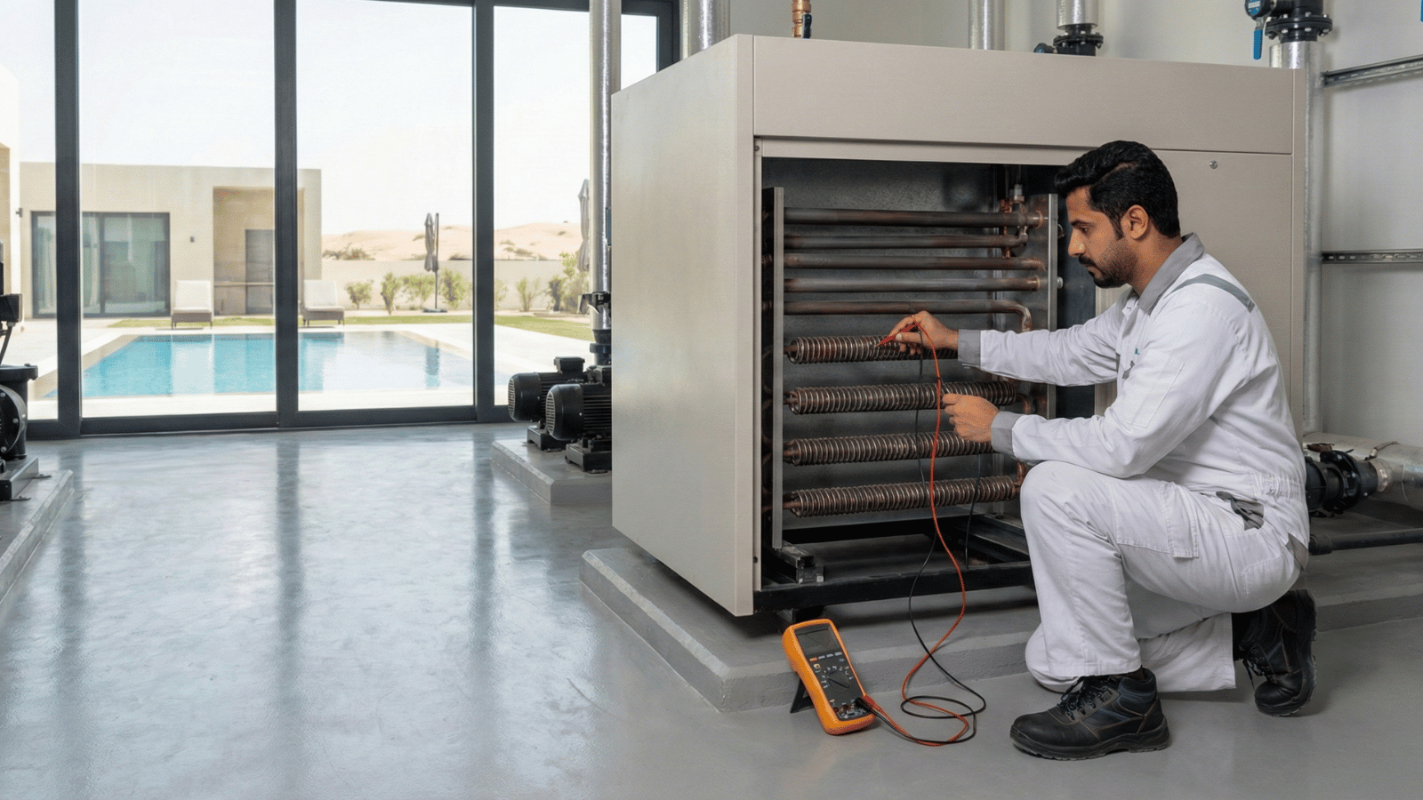 عند استدعاء فني سخانات مسبح من فريقنا، نتبع خطوات فحص صارمة لضمان جودة الإصلاح: