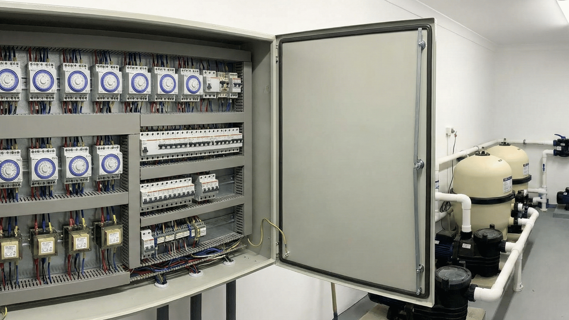 تشمل صيانة كنترول مسابح فحص لوحة الفلاتر، ضبط توقيت التشغيل الآلي (Timer)، وتأمين الدوائر الكهربائية ضد الرطوبة والمياه عبر فحص عوازل الـ IP65. يتم اختبار قواطع الحماية من التسريب الأرضي (ELCB/RCD) لضمان سلامة السباحين، مع فحص “الكونتاكتورات” المسؤولة عن تشغيل مضخات الفلترة والسخانات، وضمان تزامن عمل نظام التعقيم بالكلور مع تدفق المياه لمنع تراكم الغازات الخطرة.